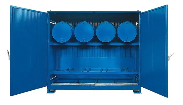 Linea completa di depositi e armadi per lo stoccaggio esterno di fusti. Versioni specifiche per liquidi infiammabili, acidi, pericolosi e inquinanti.