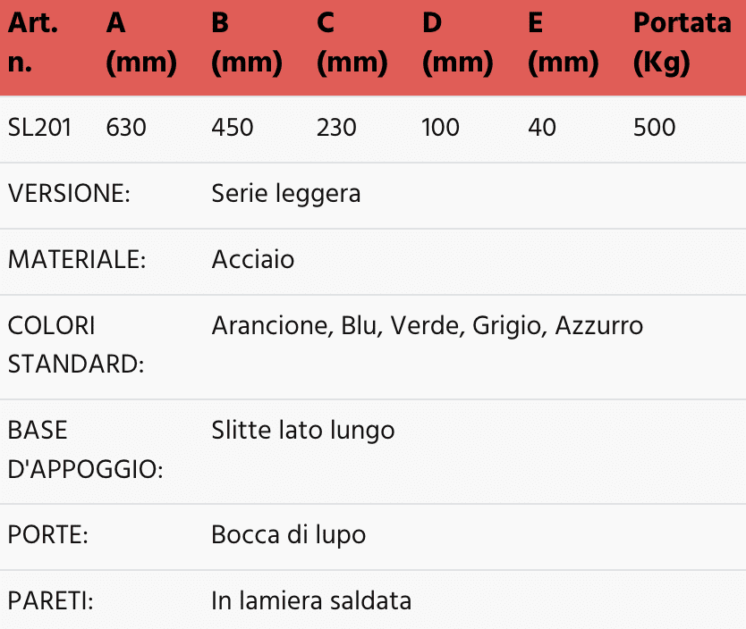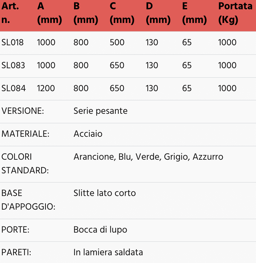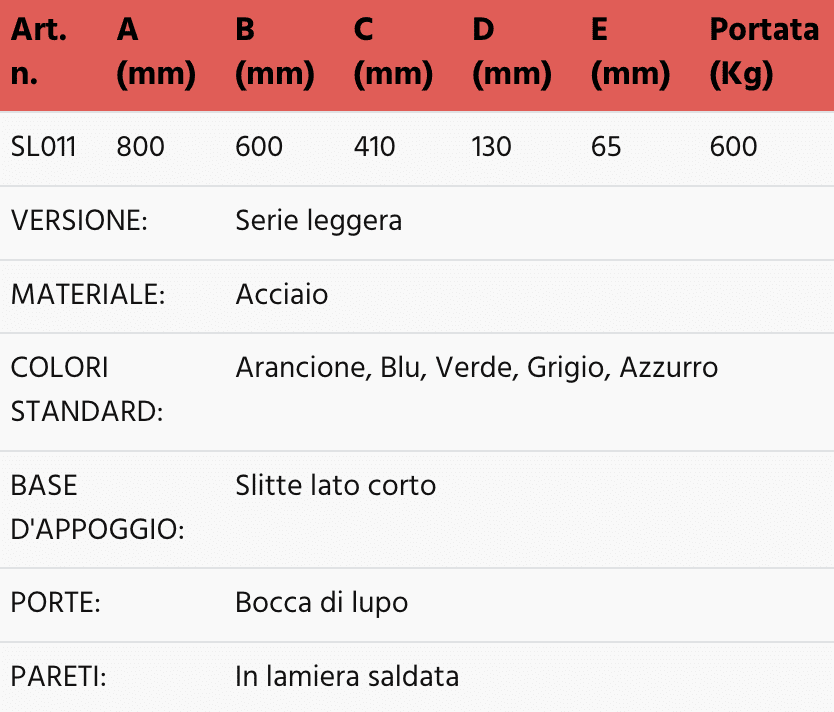 Dati tecnici contenitori bocca di lupo con slitte lato lungo – Portata 500 Kg