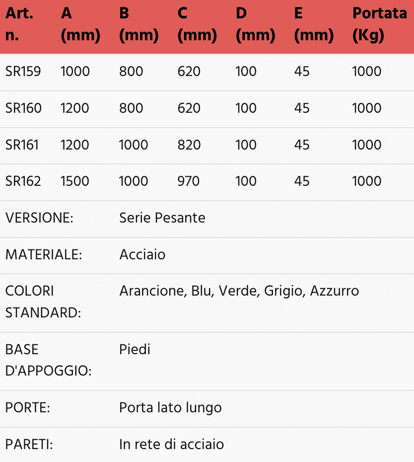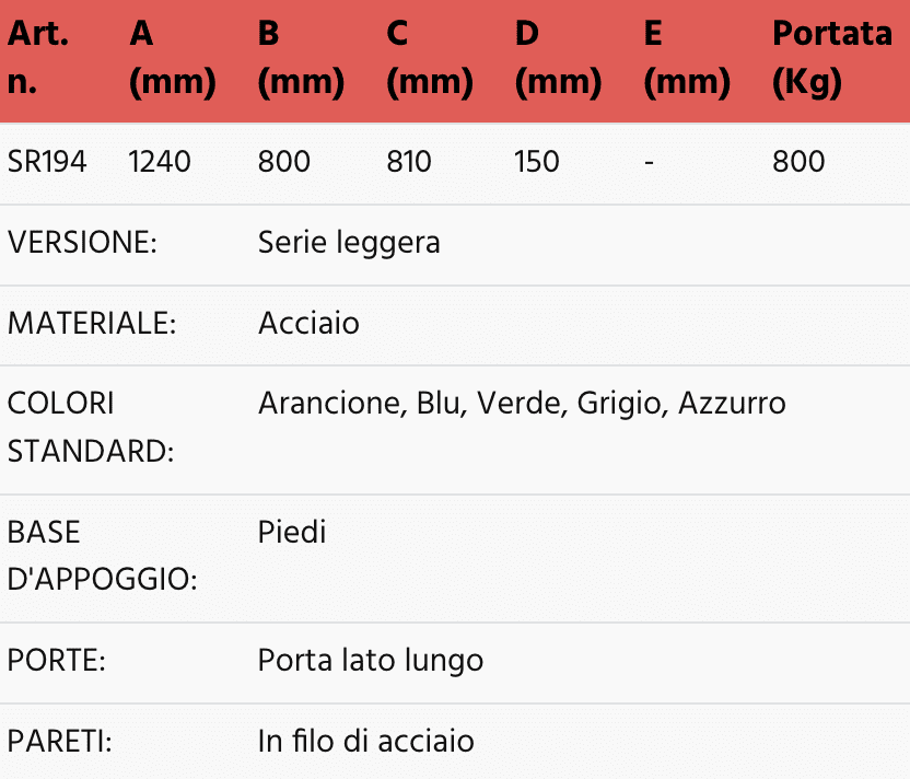 Dati tecnici modelli in filo metallico con portata 800 Kg
