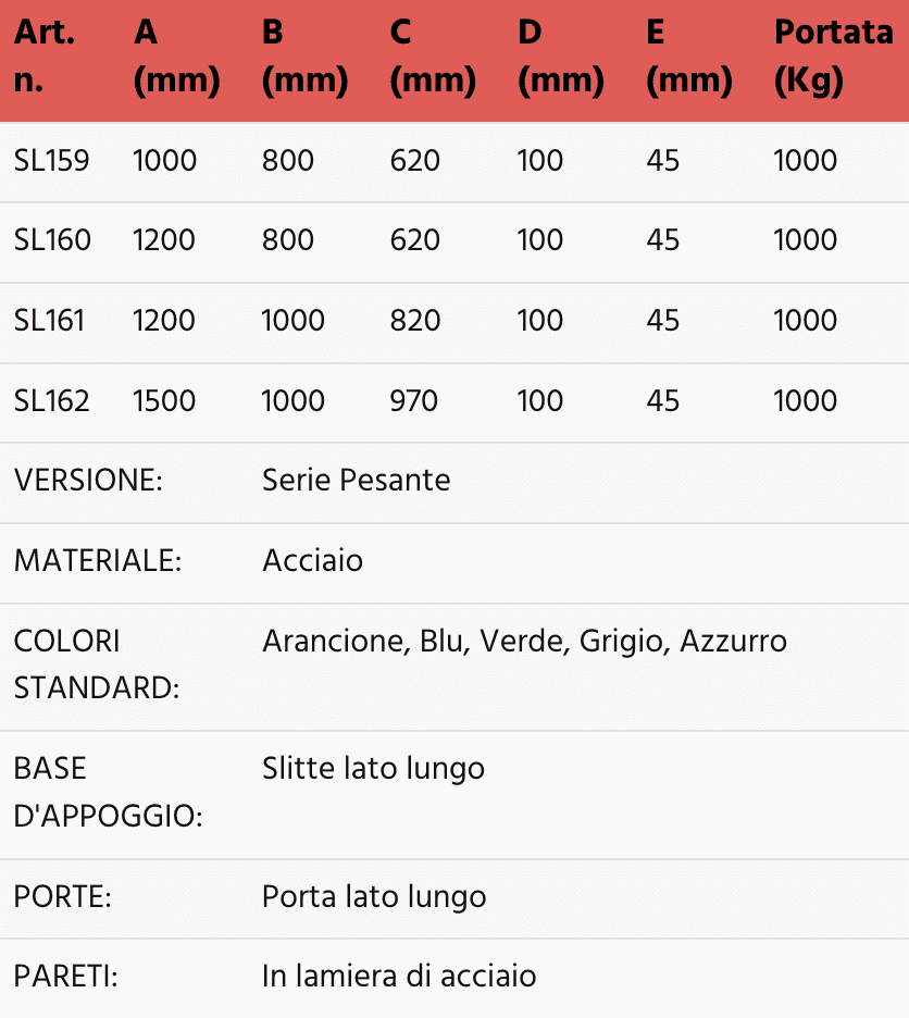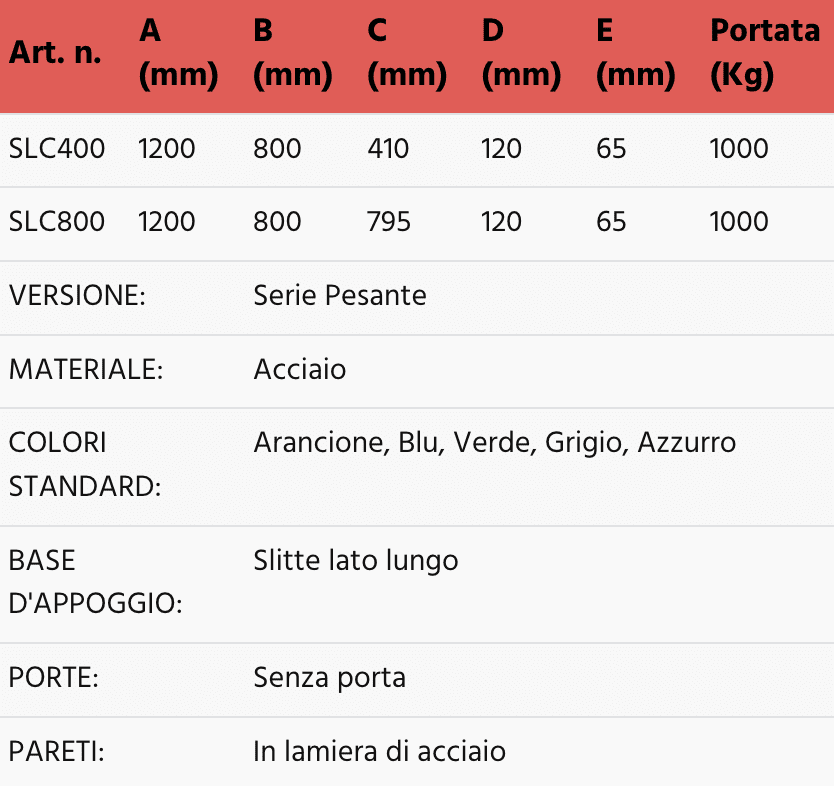 Dati tecnici modelli con slitte lato lungo e coperchio – Portata 1000 Kg
