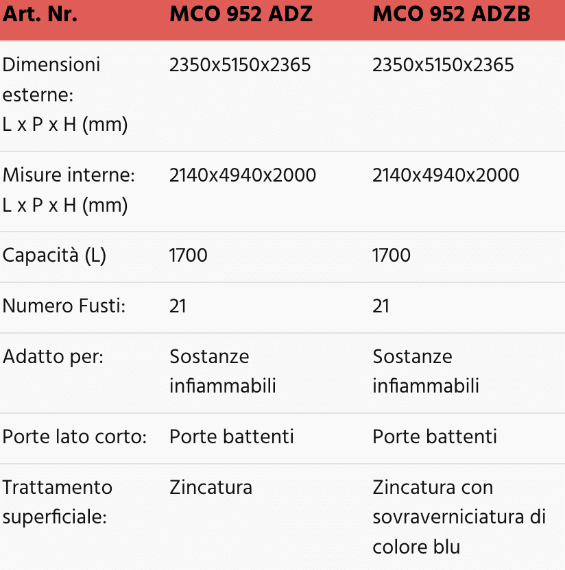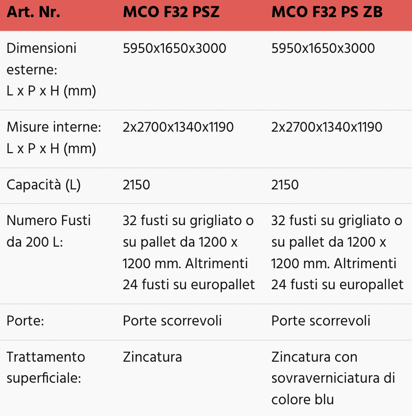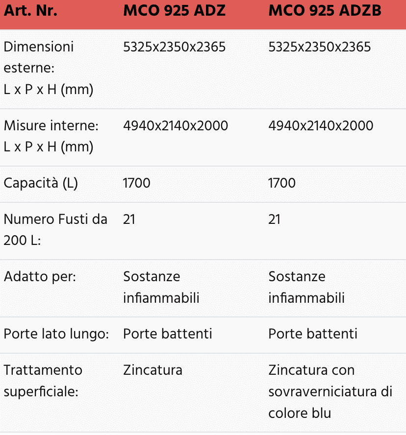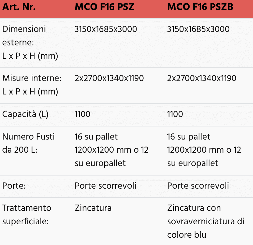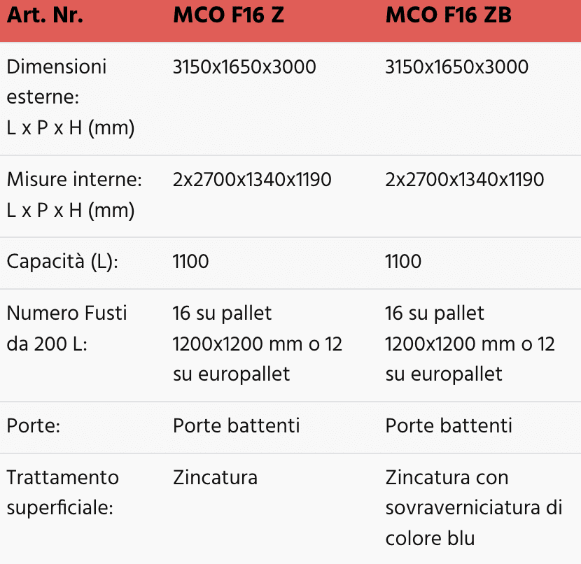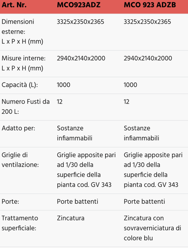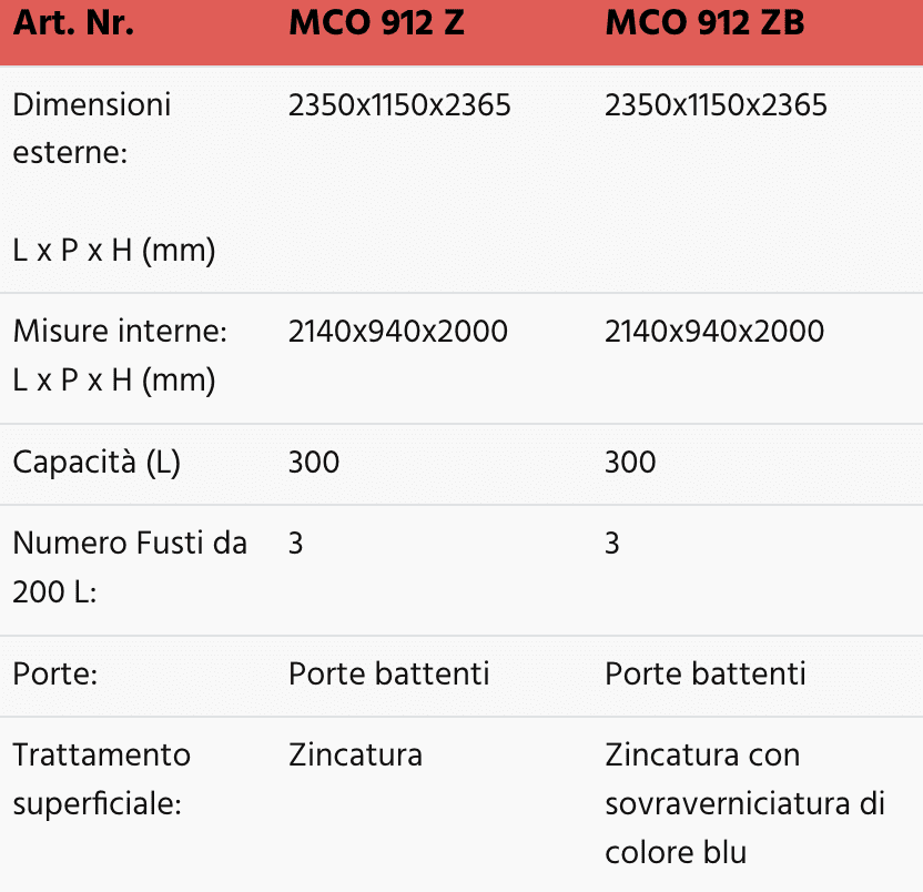 Questi modelli sono quindi ideali per lo stoccaggio di 3 fusti da 200 L e di piccoli contenitori per un volume di raccolta della vasca pari a 300 L e le versioni MCO 912 AD sono indicate per i prodotti infiammabili.