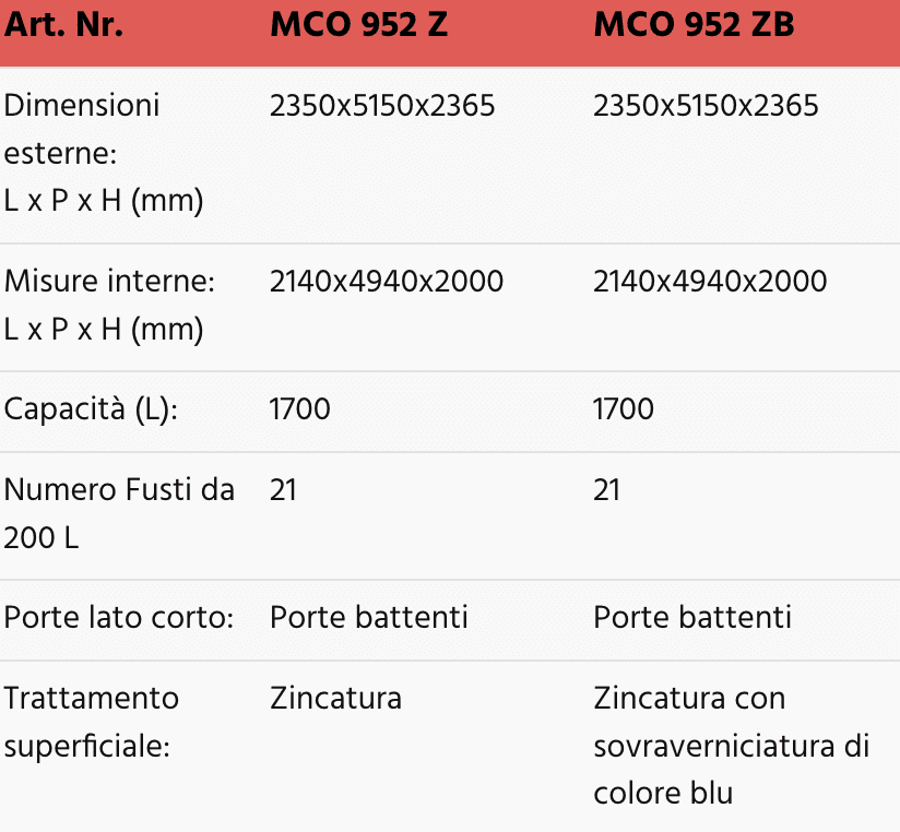 I modelli MCO 925 e MCO 952 permettono lo stoccaggio di 21 fusti ottimizzando gli spazi esterni a disposizione.