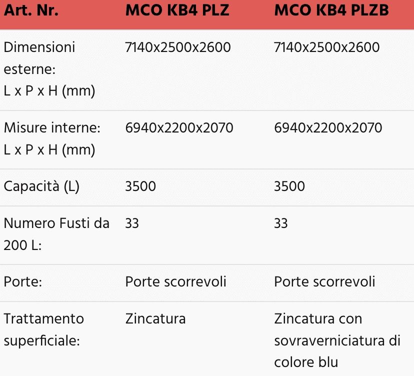 I modelli MCO KB4 PLZ sono modul container a un piano ideali per lo stoccaggio di 33 fusti direttamente su grigliato.
