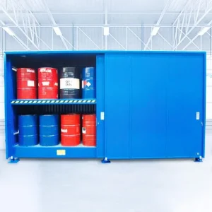 Modul container per lo stoccaggio di fusti e altri contenitori primari più piccoli. La modularità consente una grande flessibilità nella gestione degli spazi e un agevole trasporto con muletto. I modelli standard sono disponibili nelle versioni con porte scorrevoli, a battenti, senza porte, con telo PVC e su 1 o due piani.